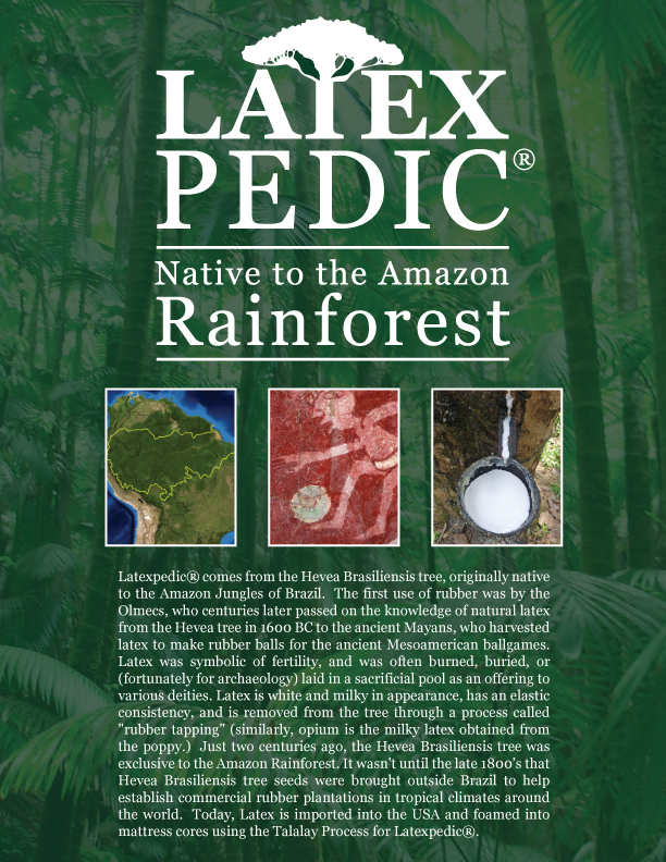 Latexpedic Mattresses start out as a Seed; that grows into the Hevea Brasiliensis Tree, (Originally only native to the Amazon Rainforest) When grown the tree is tapped like maple syrup, where a white, milky substance is tapped.