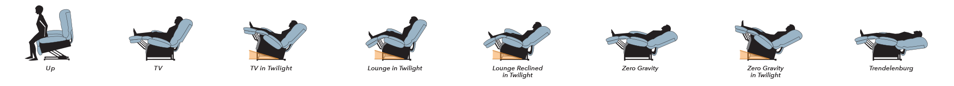 Twilight positioning is like no other seating system in the world. Its many health benefits include achieving a back angle that is similar to standing, putting less pressure on the spine and reducing spinal muscle fatigue. Our 30 degree angle takes the usual TV watching and zero gravity positions to a whole new level. Only Twilight offers a TRUE zero gravity sensation. Prepare for an exceptional seating and recline experience!