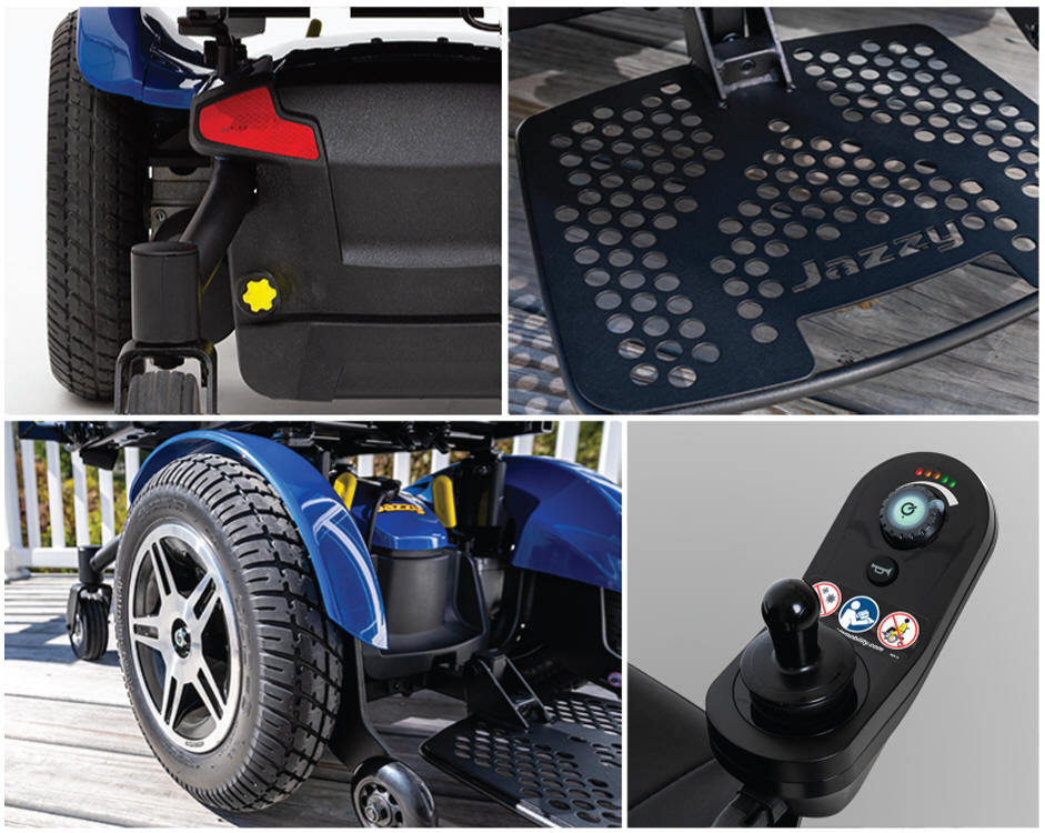![]() ![]() Jazzy Elite 14 300 lbs. weight capacity Up to 4 mph maximum speed 24" turning radius Up to 18 miles per charge at 300 lbs., Up to 21 miles at 200 lbs. Comfortable, depth-adjustable, limited recline high-back seat with headrest Easy rear access to batteries Intuitive controller is easy to operate Angle-adjustable foot platform offers greater comfort Front-wheel drive design for excellent maneuverability 14" knobby tires and optimum weight distribution provide superior traction Red or blue color-through shroud 40A Dynamic Linx controller Extended 13-month limited warranty |
